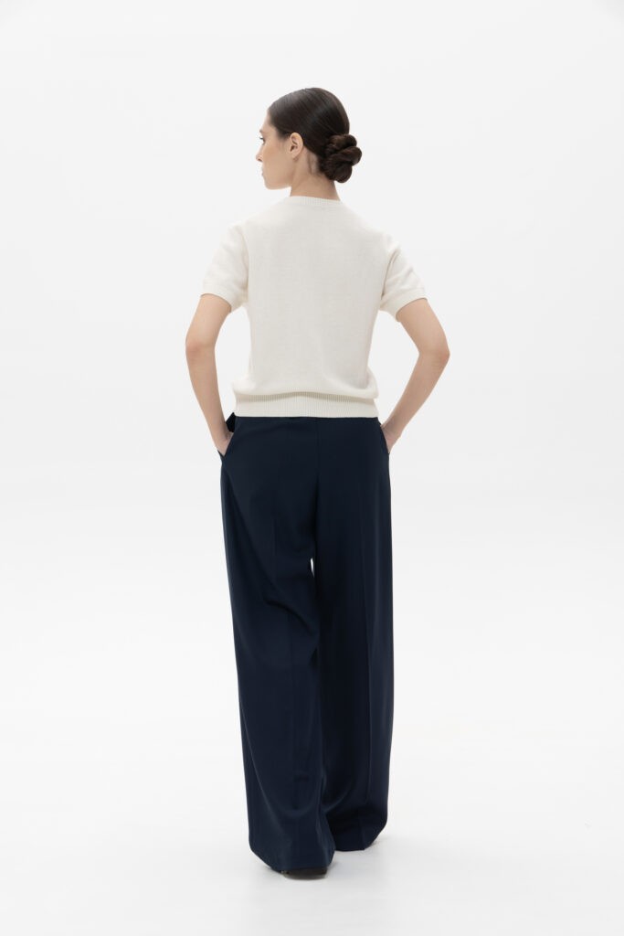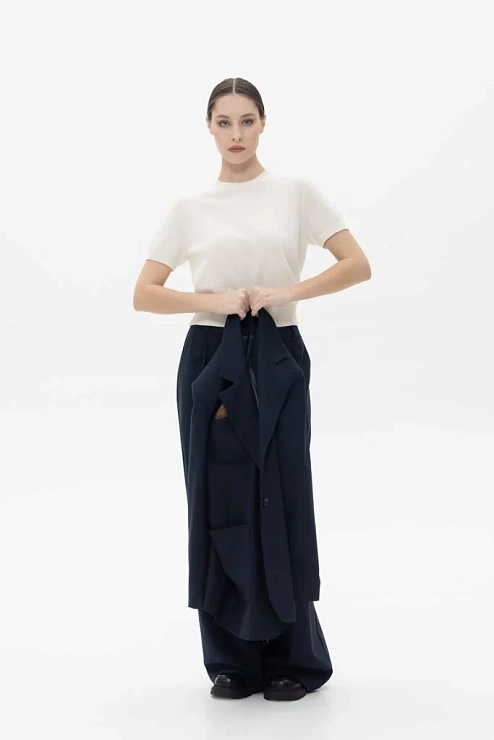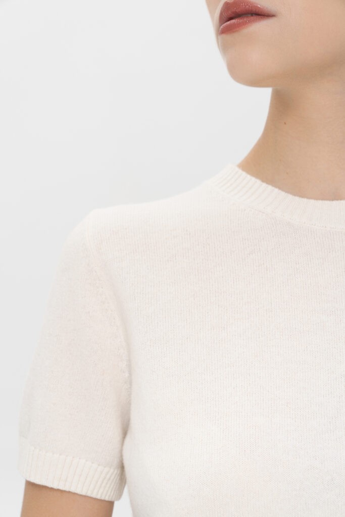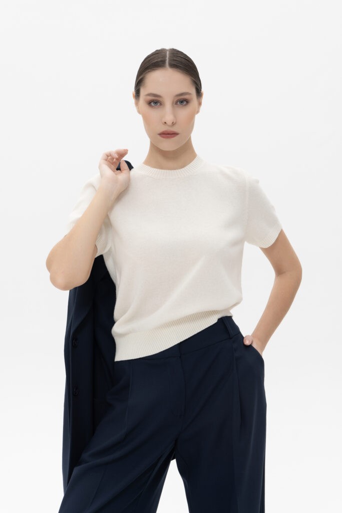 Классический джемпер из шерсти. Особенности модели: прямой силуэт, вязанная резинка по горловине, рукавам и низу изделия, короткий рукав, круглая горловина. Шерстяной трикотаж делает изделие тонким и пластичным. Джемпер с коротким рукавом выгодная альтернатива футболкам. Стилизуйте его как нижний слой с жакетами и легкими куртками или носите как самостоятельное изделие с брюками, юбками или джинсами.