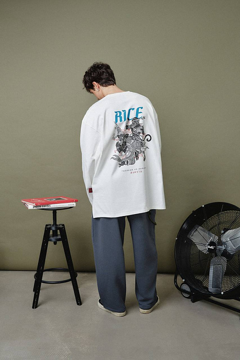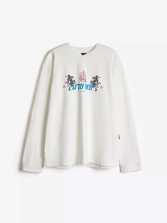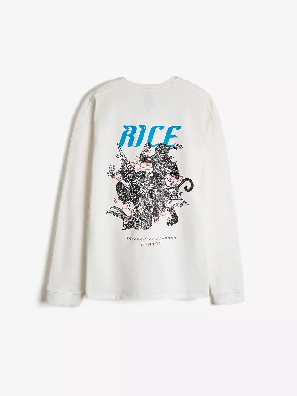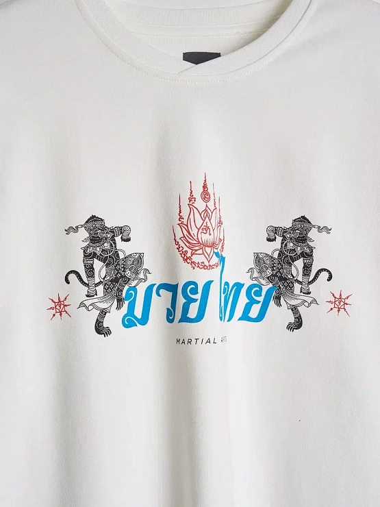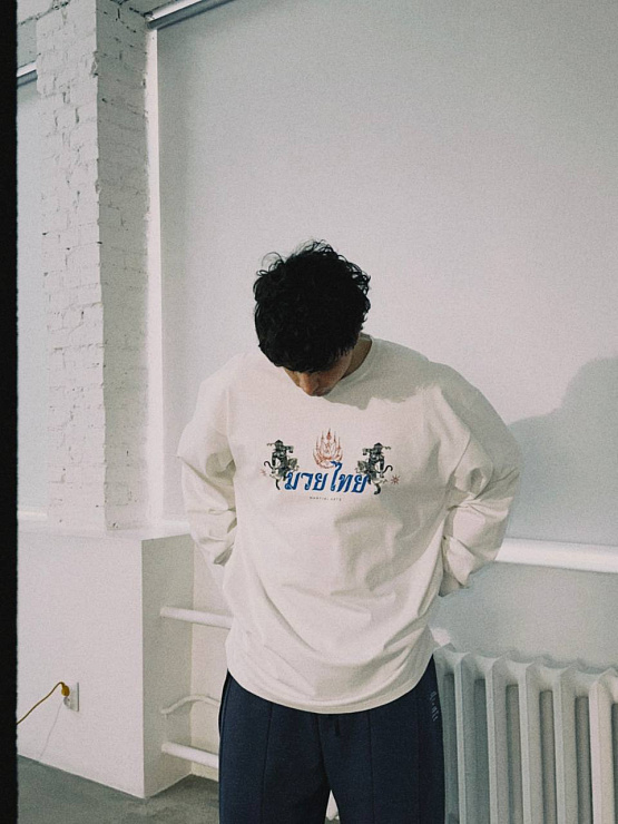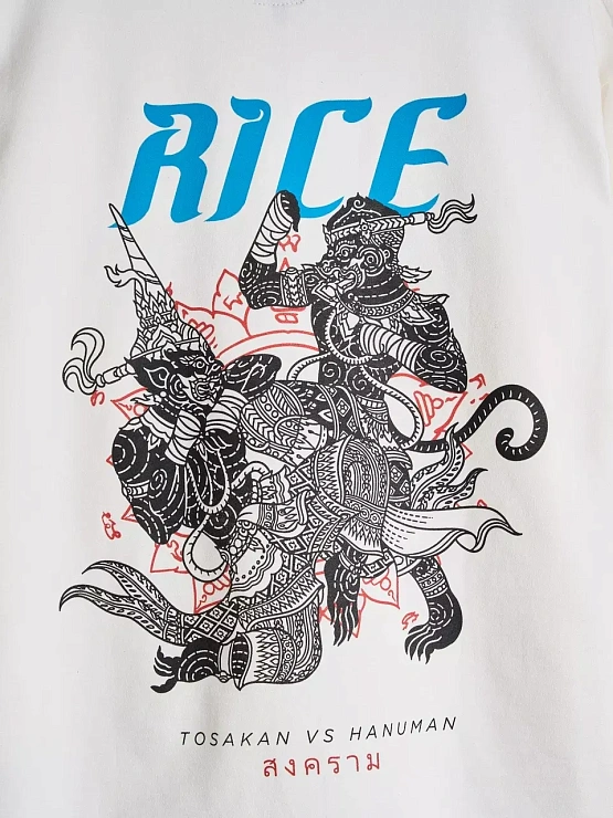 Лонгслив, вдохновлённый философией муай тай и тайской мифологией. На спине — схватка Ханумана и Тосакана как символ внутренней борьбы и дисциплины. Плотный хлопок 300 г с велюр-эффектом, азиатские разрезы и косой ворот создают форму, в которой удобно двигаться и жить. RICE продолжает развивать тему восточных единоборств —как культуры, как пути, как образа мышления.